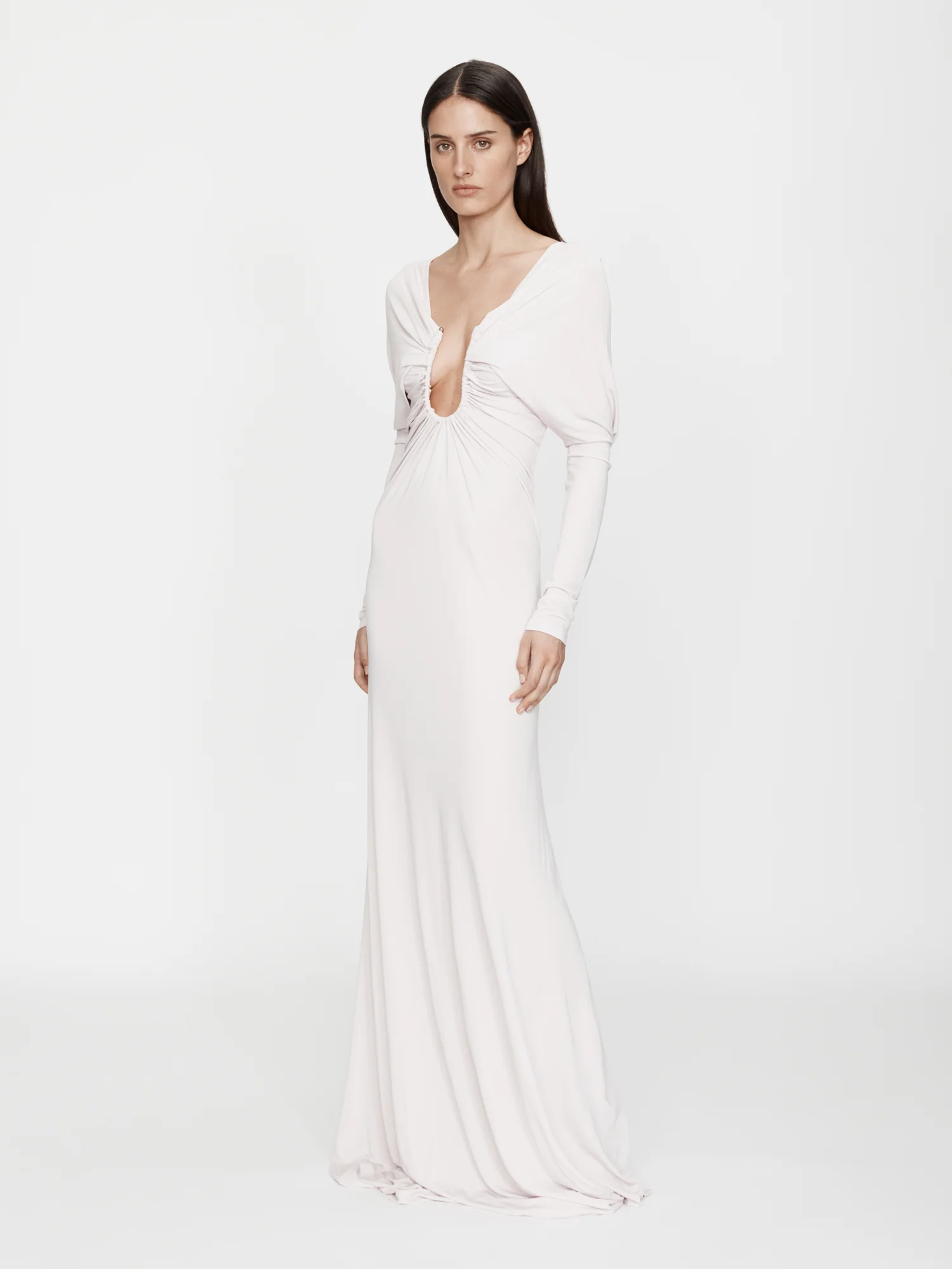Evolved from the brands signature arced palm silhouette, sculptural hardware anchors a plunging neckline in this shawl gown. Crafted in fine interlock jersey that ruches and defines the waist.