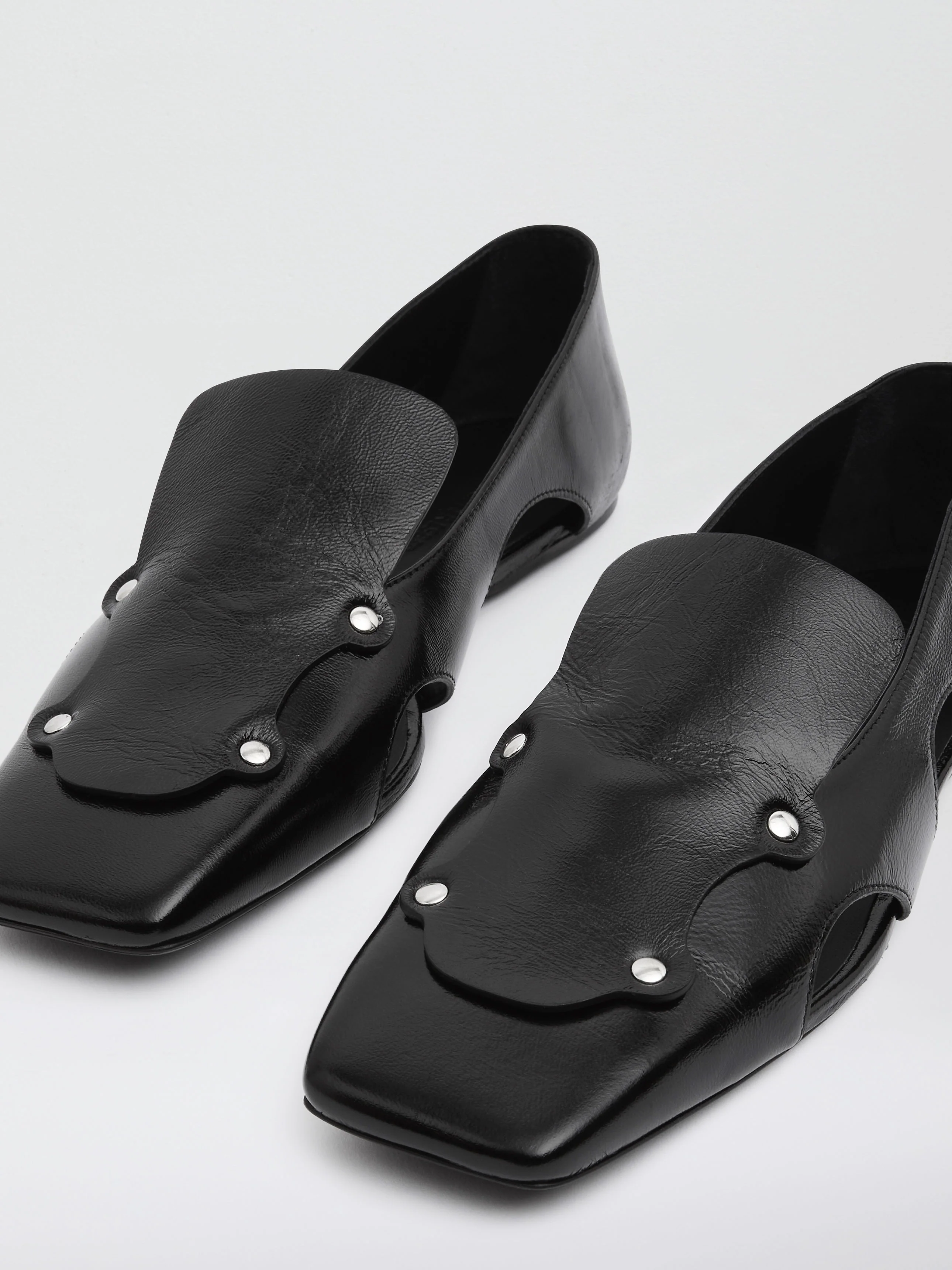 Raw edges and considered cutouts are studded onto a wrinkled patent loafer. Finished with a sleek square toe and considered cut outs.