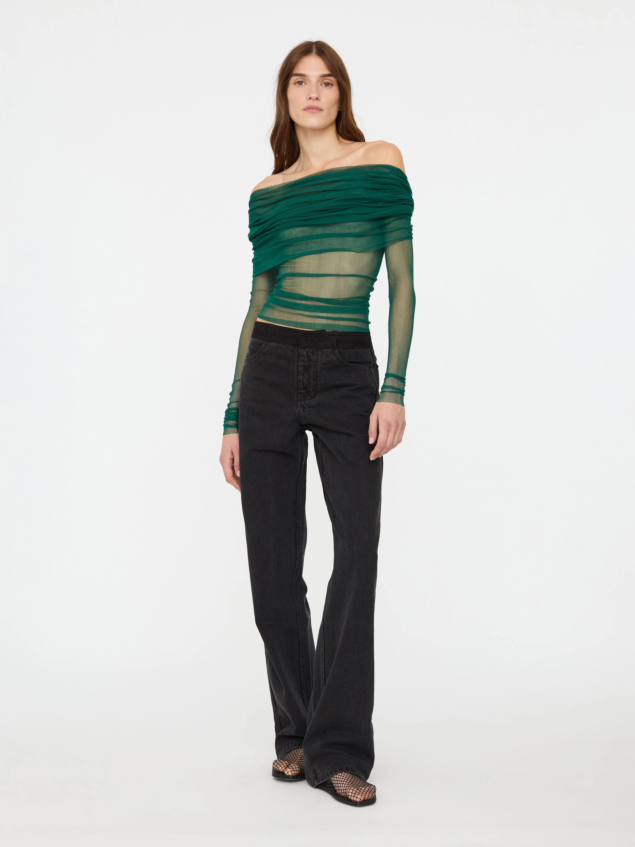 Flattering proportions are reinvented through this slouchy wide leg jean. Cut in a washed black denim, finished with a contrast deconstructed waistband.