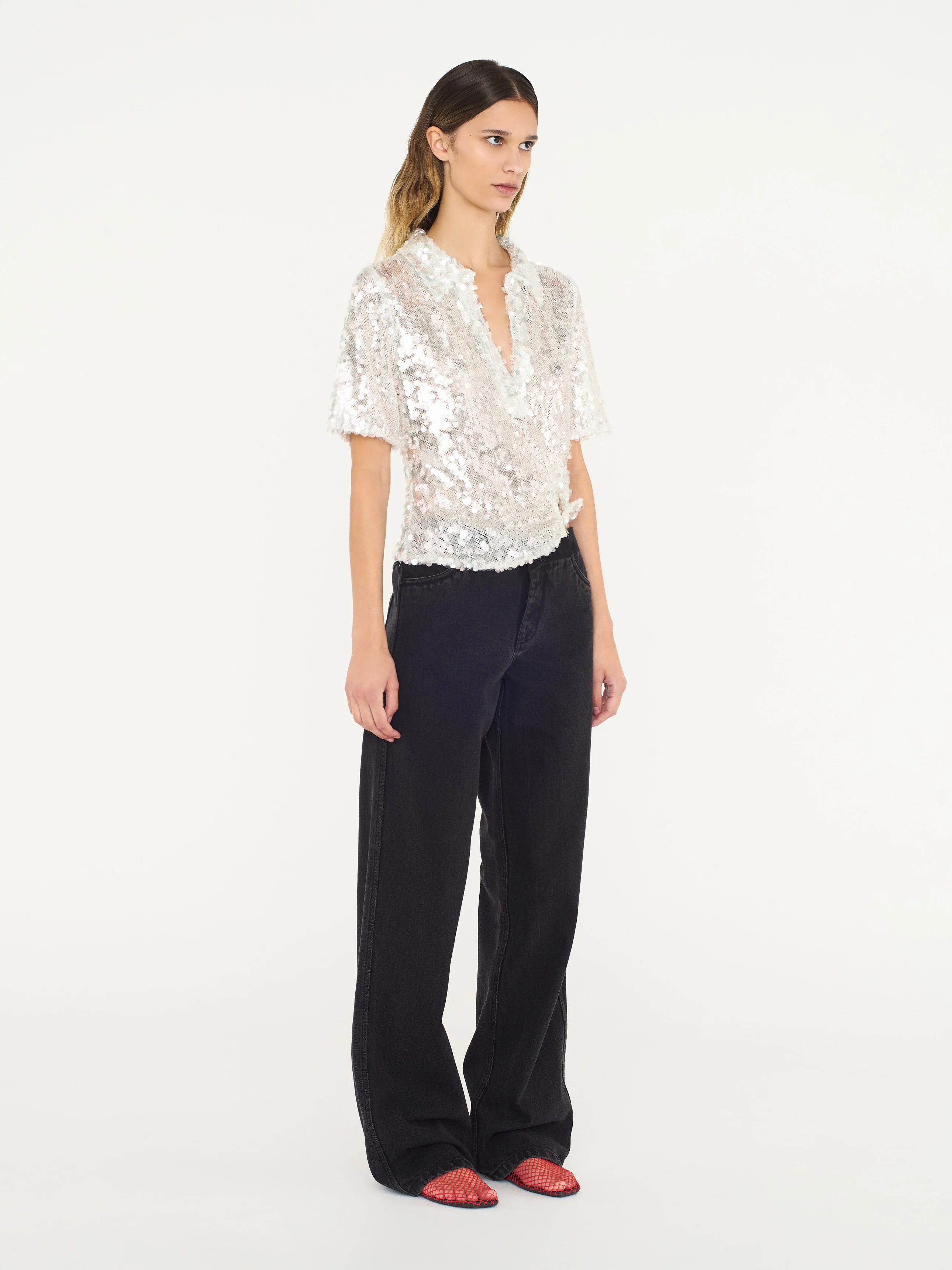 Modern embellishment is revealed with this glistening polo inspired shirt. Composed of opalescent sequins, layered over a canvas of mesh anchored by a sculpted wire insert that forms the waist.