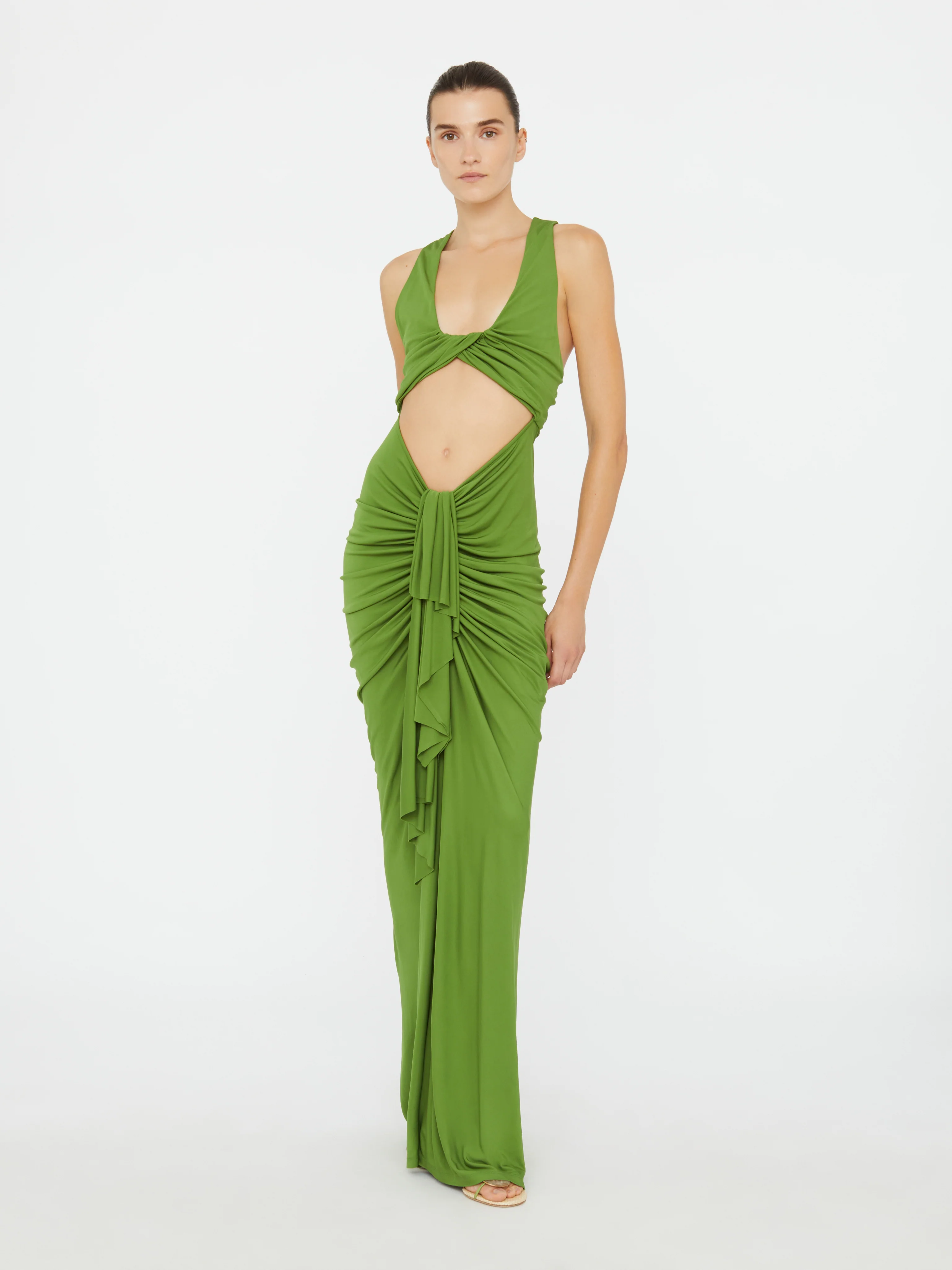 A Christopher Esber signature silhouette is reimagined in an energetic Saffron. This sleeveless draped jersey maxi gown is artfully constructed with an exposed midriff and cascading draped panel. Refined by a plunging neckline and signature cut-out accents.