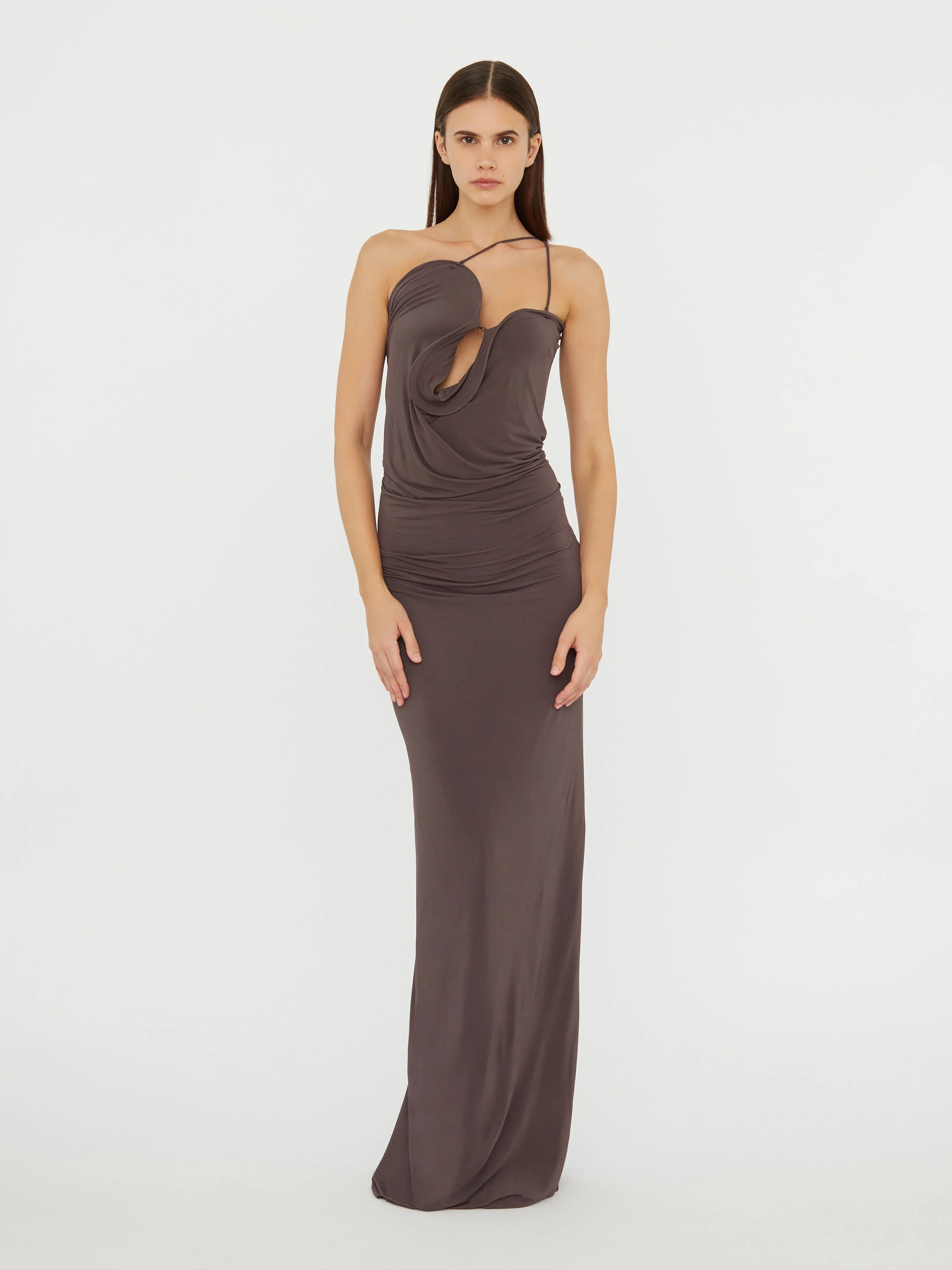 Fine Italian jersey is anchored by sculpted wave hardware. This artisanal maxi column dress scoops low at the neck and suspended by fine straps that meet at one shoulder.